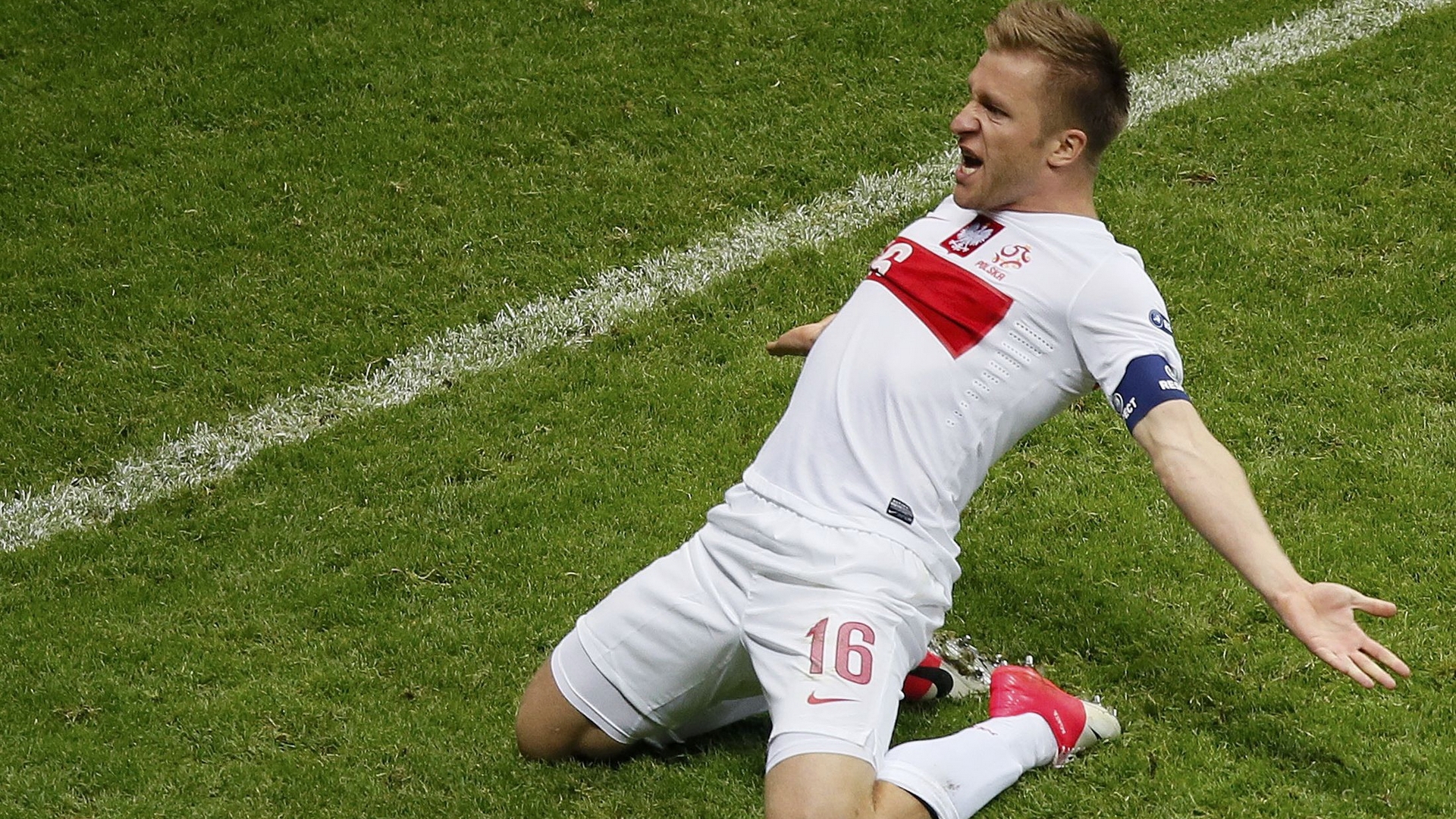Description: A man laying on the ground with his arms out and his hands out in the air as he celebrates.