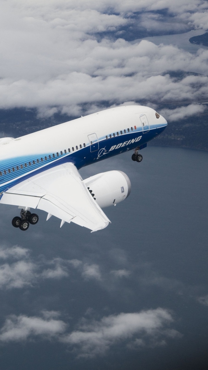 Description: A large jetliner flying through a cloudy sky above the clouds in the sky above the clouds is a blue and white plane.