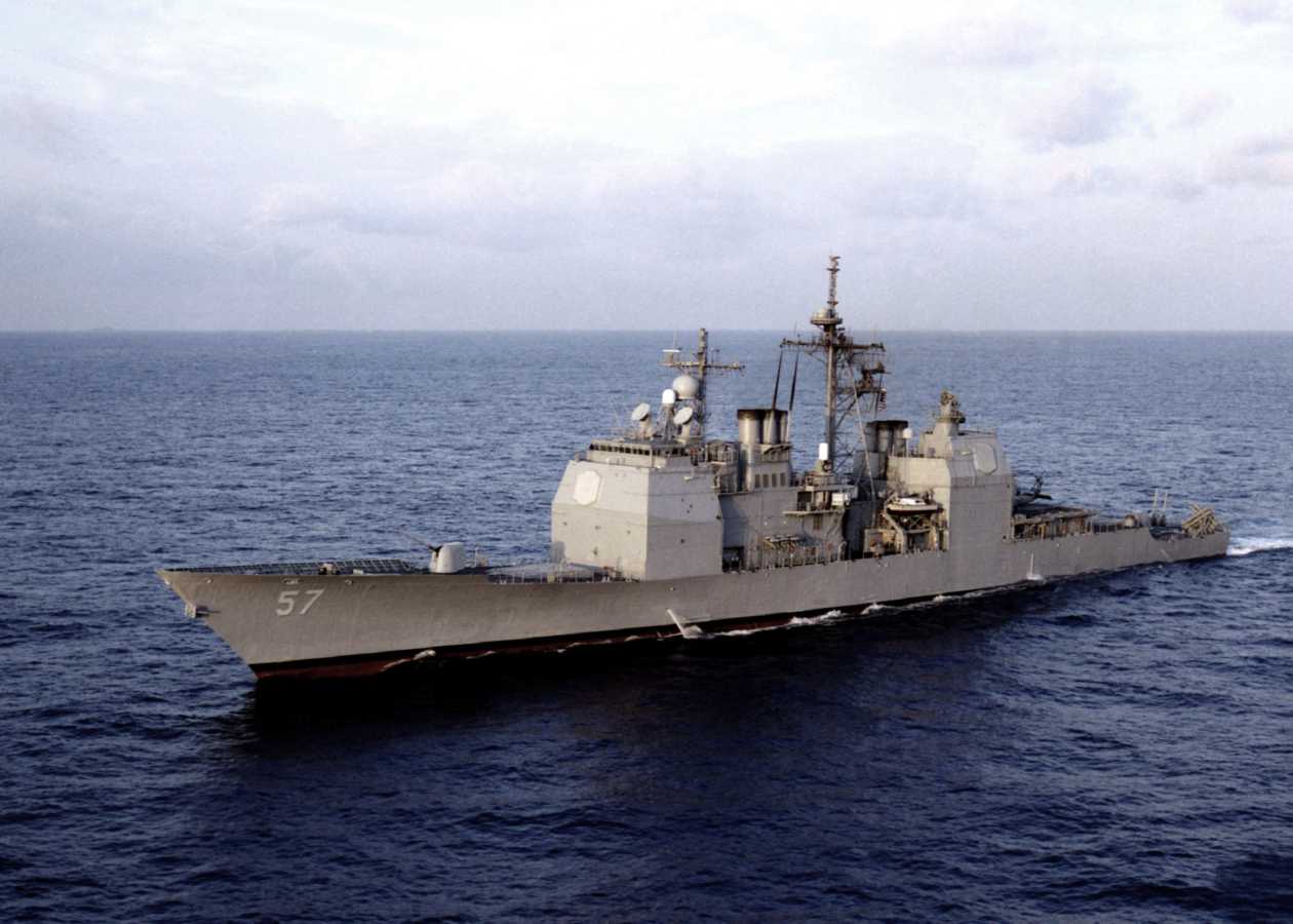 Description: A large gray ship in the middle of the ocean with a boat in the background and a boat in the water.