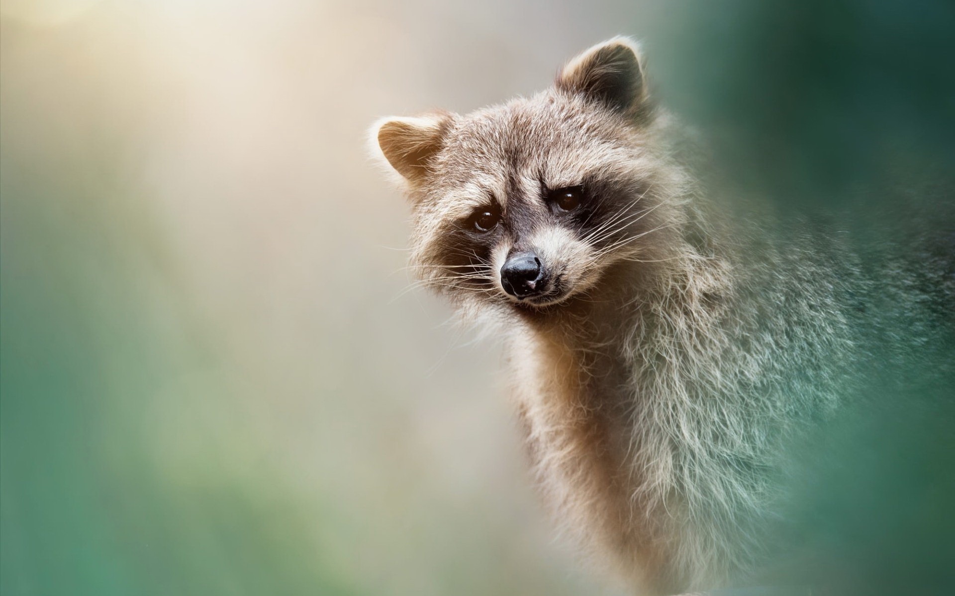 Description: A raccoon looking at the camera with a blurry background of grass and trees in the background.