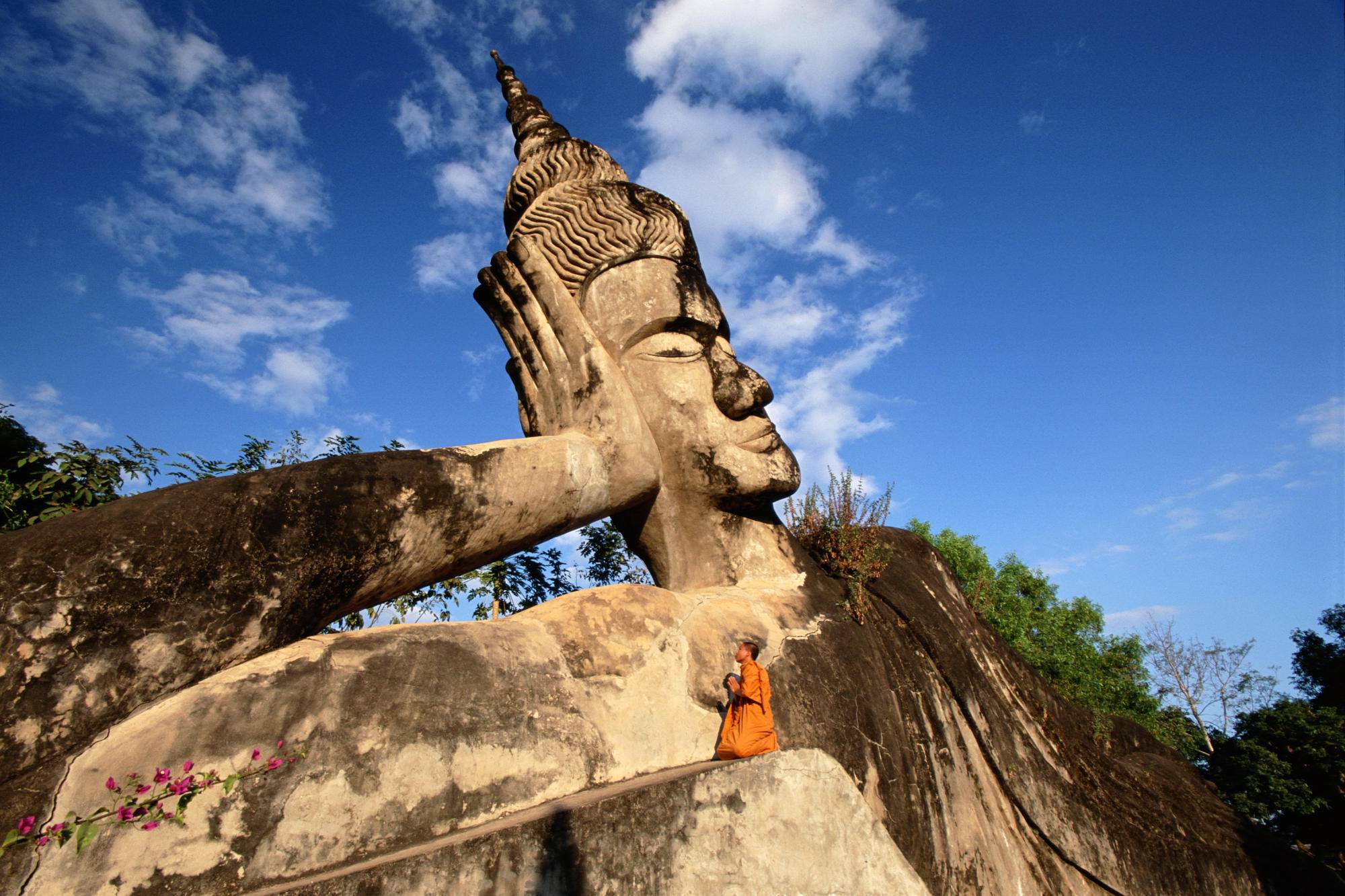 Description: A statue of a person with a sky background and clouds in the background.